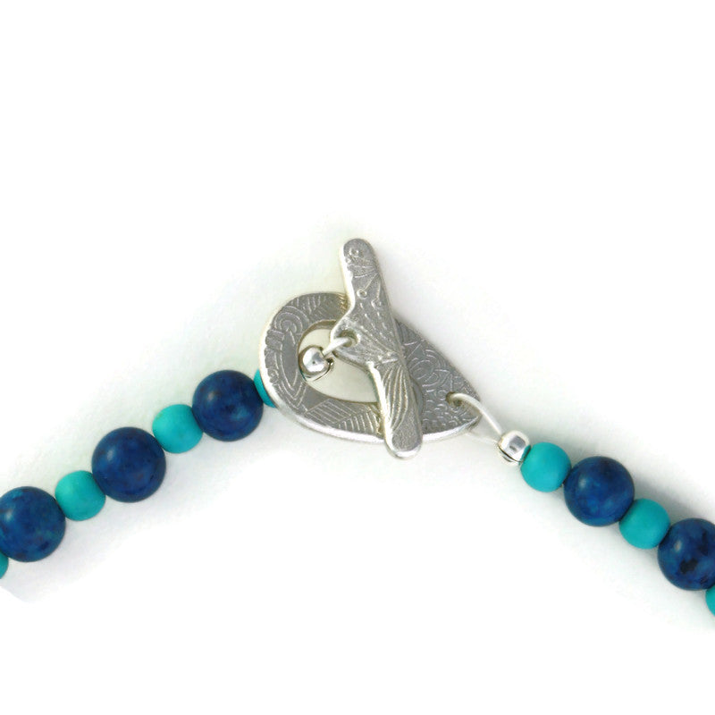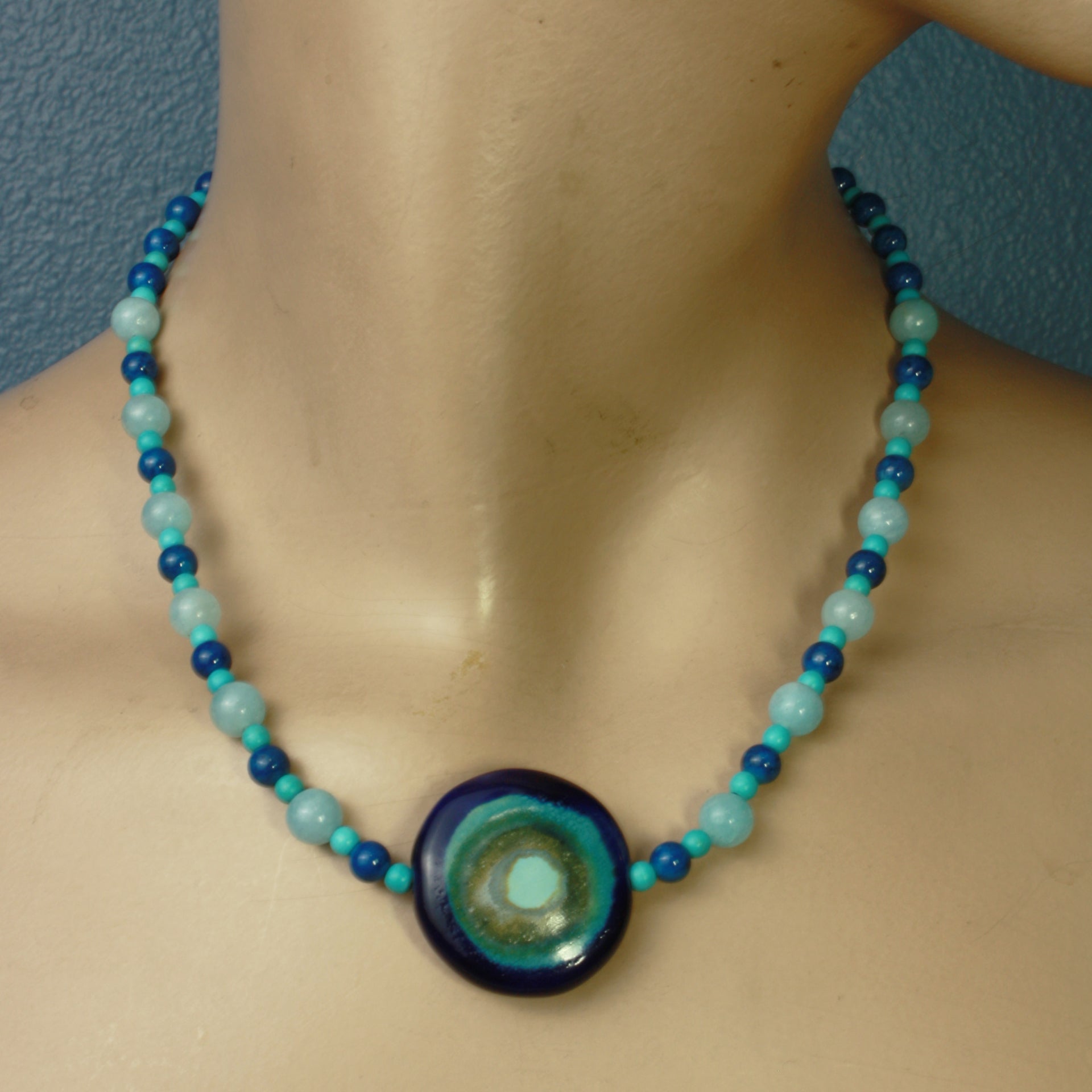 This Kazuri bead has rich blues, including cobalt. The strand is Angelite rounds, Lapis Tapers and Turquoise spacers.